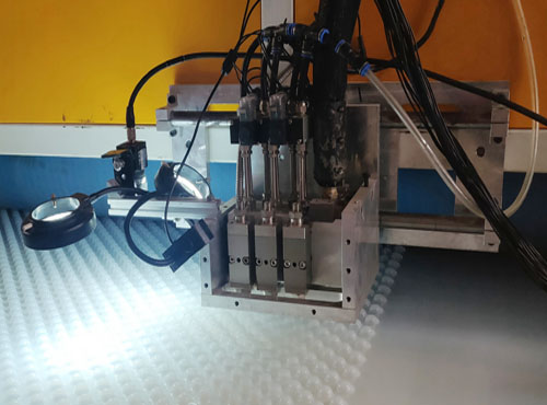 自粘式防排水板自動(dòng)涂膠設(shè)備。 通過(guò)視覺(jué)識(shí)別引導(dǎo)噴膠機(jī)動(dòng)作,實(shí)現(xiàn)快速、精確噴膠,在滿(mǎn)足產(chǎn)品使用要求基礎(chǔ)上,減少了自粘膠用膠量,降低了工人勞動(dòng)強(qiáng)度,提高了產(chǎn)品質(zhì)量,為企業(yè)創(chuàng)造更多的利潤(rùn)。